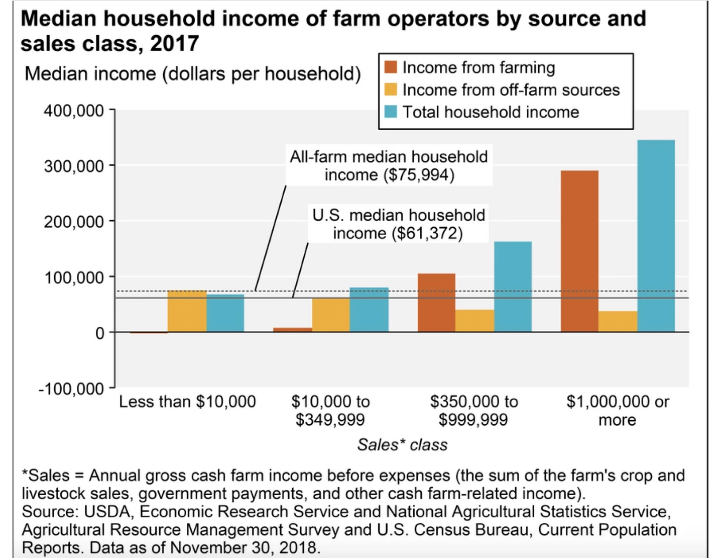 We have come into farming at a terrible time. As I have written about before – very few people in farming make a living. But it is not just a bad year, or that sustainable farming is hard. It is that farming is not working in the US, as shown in the two graphs below.